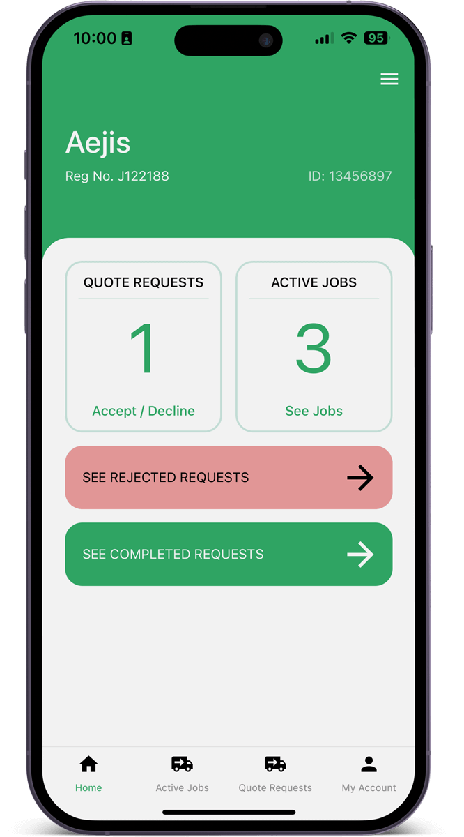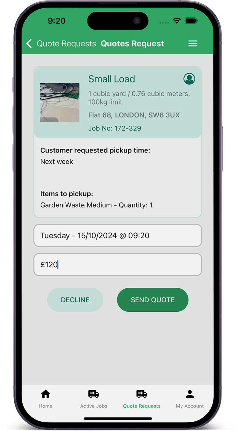 Each quote request will detail what needs to be picked up, the address and any scheduling requests, there will be a photo of the waste to be collected to help you calculate your quote. Enter a pick up date & time together with your quote and send. The customer will be notified that they have a pending quote to accept. You also have the option to decline a job request.