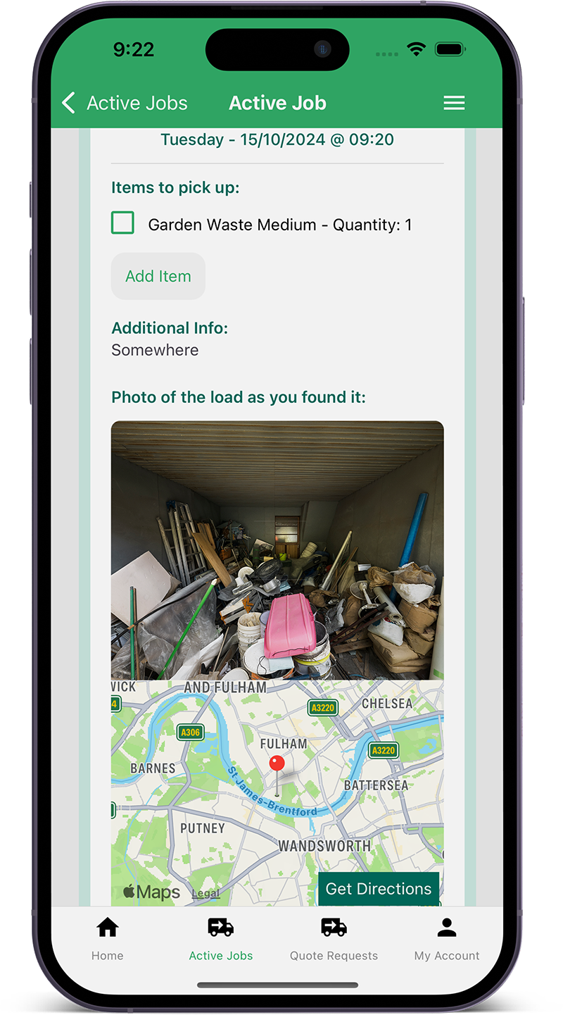 Once your quote is accepted and scheduled for pick up, follow the instructions in the app to make sure that you’re picking up what was requested and upload a photo. Follow the prompts to send a notification that the waste has been collected. Once the waste has been disposed of at the waste or recycling centre, follow the in-app prompts and send a notification to the client to notify them that their waste has been disposed of.